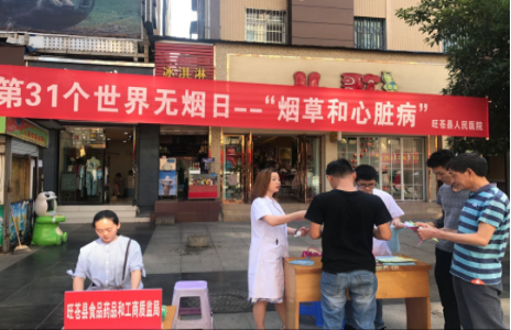 第31个世宣传活动----为了你和家人的健康,请远离香烟发表时间:2018-06-05 15:53 今年5月31日是第31个“世界无烟日”。在县卫计局的组织下,由我院预防保健科具体落实,在县电影院步行街进行“烟草和心脏病”为主题的宣传活动。活动中向广大过往市民广泛宣传吸烟的危害;测量血压50余人次;发放宣传资料200余份。其意义是宣传不吸烟的理念,提醒世人吸烟有害健康,呼吁全民吸烟者主动放弃吸烟,号召所有烟草生产者、销售者和整个社会一起行动,投身到反吸烟运动中去,为人类创造一个无烟草